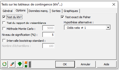 Dans l’onglet Options, activez les options Test du khi² et le test exact de Fisher.
