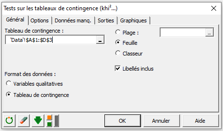 Dans l’onglet Général, assurez-vous d’avoir activé le format de données Tableau de contingence. Puis sélectionnez le tableau dans le champ tableau de contingence. Dans la situation où vos données sont organisées verticalement (individus en lignes et variables en colonnes), activez le format variables qualitatives. Si vous cherchez à transformer vos données d’un format vertical à un tableau de contingence, ce tutoriel vous guidera.