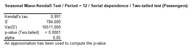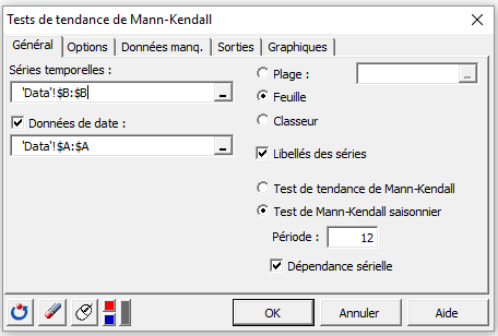 Pour cet exemple, nous allons appliquer le test de Mann-Kendall avec saisonnalité en prenant en compte le fait qu’il existe une saisonnalité (12 mois) et qu'il y a une dépendance sérielle.