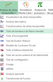 Une fois XLSTAT lancé, cliquez sur l’icône Time et choisissez la fonction Tests de tendance de Mann-Kendall.