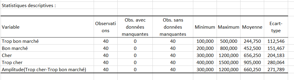 Les statistiques descriptives permettent notamment d'identifier les valeurs minimum et maximum. L'amplitude est calculée sur le prix trop bon marché et le prix trop cher. On note notamment que pour au moins une personne, l'écart est de 1200 Euros ce qui est assez important.
