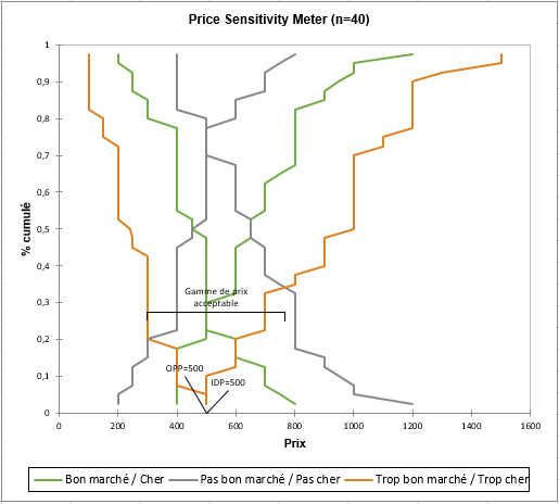 Le résultat caractéristique de ce type d'analyse de sensibilité au prix est un graphique présentant une série de courbes dont les intersections déterminent des prix critiques : à partir des données de l'enquête on construit six courbes de distributions cumulées (ou leurs opposées), d'abord pour les quatre types de prix recueillis (trop bon marché, bon marché, cher, trop cher), puis, par déduction, on calcule la distribution pour pas bon marché et pas cher.