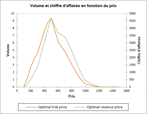 Le graphique ci-dessus permet d'observer l'évolution du volume et du chiffre d'affaires en fonction des prix. Nous voyons que l'optimum de 500 se détache assez nettement.