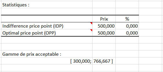 L'intersection entre les courbes des trop bon marché et des trop cher correspond au prix pour lequel autant de personnes considèrent que le produit est trop cher ou trop bon marché. En principe ce prix qui correspond à des avis totalement opposés concerne peu de consommateurs. Ce prix est nommé le Optimal Pricing Point (OPP), dans le sens où, en principe, un maximum de consommateurs devrait pouvoir acheter le produit.