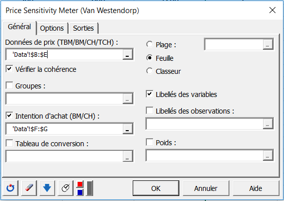 Dans l'onglet Général, sélectionnez les quatre variables "Trop bon marché", "Bon marché", "Cher", "Trop cher" dans le champ Données de prix. Comme cette sélection comporte le nom de la variable, cochez lâoption Libellés des variables.