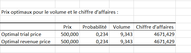 La prise en compte des intentions d'achat permet de définir le prix du produit en maximisant les chances que l'impact soit favorable sur le volume ou le chiffre d'affaires en fonction de la stratégie choisie. Dans le tableau, ci-dessus, nous voyons que le prix permettant de maximiser les deux critères est de 500â¬.
