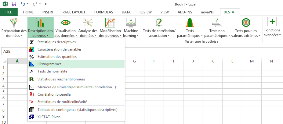 Ensuite, l'onglet XLSTAT apparaît qui permet d'accéder à différents menus vous permettant de lancer des fonctions de XLSTAT. En cliquant sur un bouton, vous activez la boîte de dialogue correspondant à la fonction.
