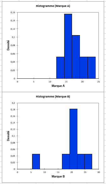 Tout d’abord, comparons graphiquement ces deux distributions en inspectant les histogrammes : XLSTAT / visualisation des données / Histogrammes.
