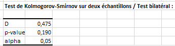 La feuille de résultats contient notamment la statistique du test de Kolmogorov-Smirnov (0.475) que l’on peut retrouver grâce au graphique de fréquence cumulée (voir plus bas). Cette statistique est associée à une p-value (0.133) indiquant que les deux distributions ne sont pas significativement différentes au seuil alpha = 0.05.