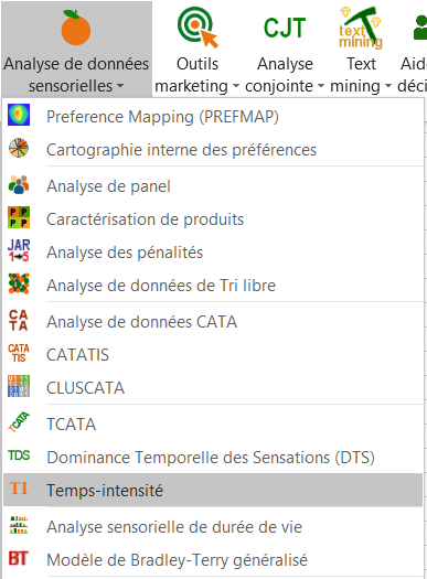 Tout d'abord, ouvrez le fichier téléchargé avec Excel et activez XLSTAT. Une fois que XLSTAT est activé, sélectionnez XLSTAT/ Fonctions avancées / Analyse de données sensorielles / Temps Intensité (voir ci-dessous).