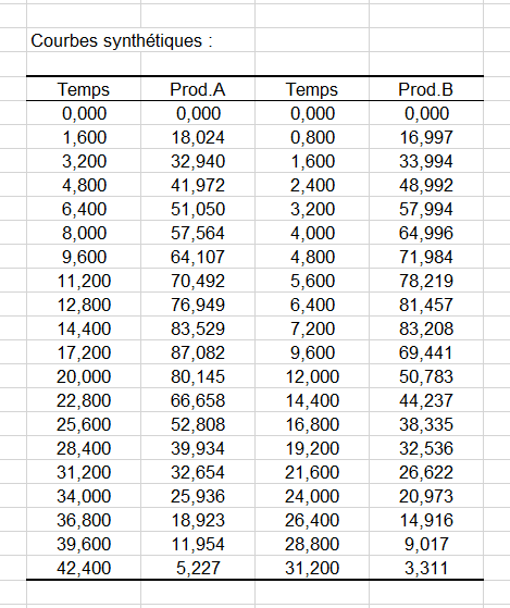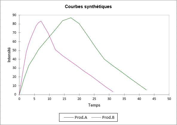 Le tableau qui suit contient les courbes synthétiques. Comme indiqué ci-dessous, il donne les coordonnées en intensité et en temps pour les deux courbes synthétiques, une pour le produit A et l'autre pour le produit B.