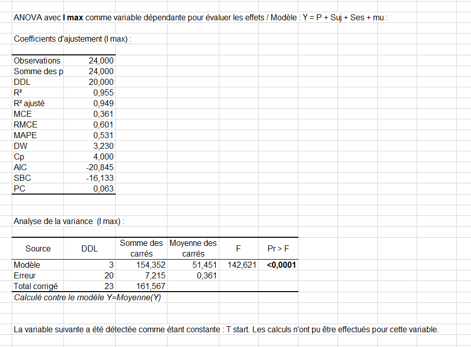 Enfin, une liste des résultats d'ANOVA effectuées avec chaque paramètre considéré comme la variable dépendante sont affichés. Par exemple, vous pouvez voir ci-dessous que la variable T start a été détectée comme étant constante. Comme elle n'apporte pas d'information pour faire une distinction entre les produits, elle a été rejetée de l'analyse.