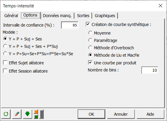 Sur le côté gauche, 3 configurations de modèles sont proposées pour l'ANOVA qui va être réalisée sur les paramètres extraits. Nous choisissons le premier pour lequel aucune interaction entre produit, sujet ou session n'est considérée. Sur le côté droit, vous pouvez activer l'option de création de courbe synthétique et sélectionner Méthode Liu et MacFie. Comme nous souhaitons générer une courbe synthétique par produit, assurez-vous d'avoir coché la case Une courbe par produit. Enfin, le nombre de bins doit être réglé à une valeur par défaut de 20.