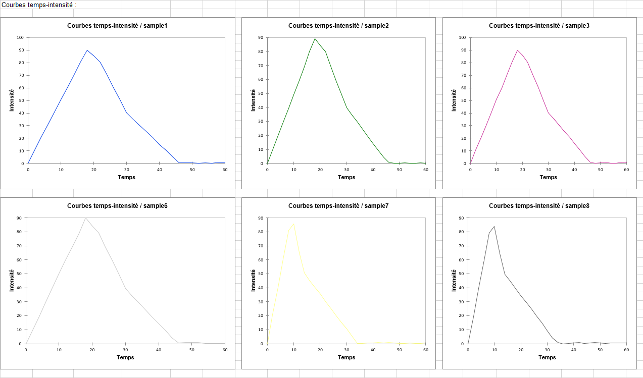 Le tableau de paramètre est suivi par un ensemble de graphiques sur lesquels sont tracées les courbes individuelles Temps-Intensité. Chaque courbe est affichée sur son propre graphique. Il est important dans une analyse Temps-Intensité de contrôler visuellement les courbes TI individuelles. L'utilisateur devrait utiliser son expertise de terrain pour identifier les erreurs potentielles d'enregistrement.