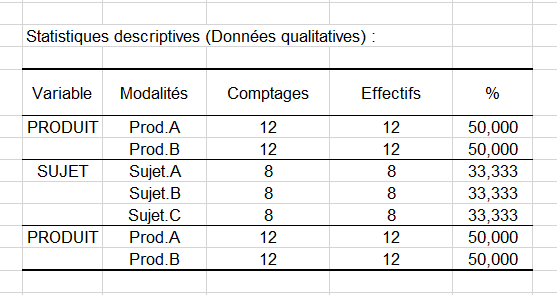 Sur la feuille de résultats, le premier tableau indique des statistiques descriptives pour la variable produits, la variable sujets et la variable sessions. Comme vous pouvez le voir ci-dessous, chaque catégorie de chaque variable est listée avec sa fréquence d'apparition dans le jeu de données.