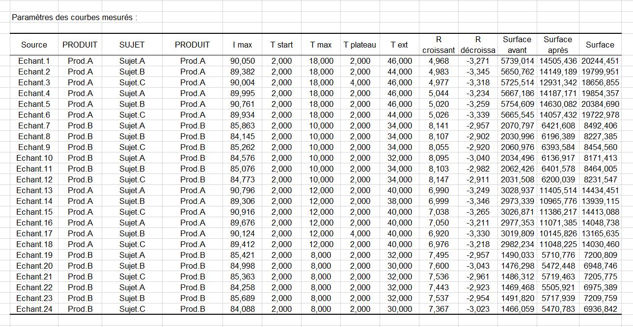 Le tableau suivant résume les paramètres de courbe mesurés. Il y a 10 quantités descriptives mesurées sur les 24 courbes intensités individuelles. Le tableau indique également le produit, le sujet et la session correspondants de manière à ce que tout l'information soit rassemblée en un seul tableau.