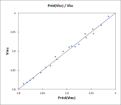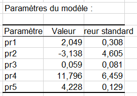 Dans notre cas, 99% de la variabilité est expliquée par les deux variables et leur interaction, ce qui constitue un excellent résultat. Le tableau suivant fournit les détails sur les paramètres du modèle après ajustement. Nous voyons que le paramètre pr5 a une valeur plus élevée que pr4. Nous pouvons conclure que l’interaction entre les deux composés a un effet plus important sur la viscosité que les concentrations elles-mêmes.