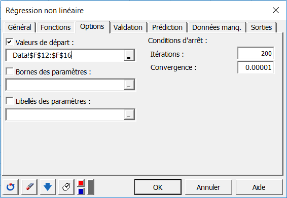 Dans l’onglet Options sélectionnez les valeurs de départ des cinq paramètres.