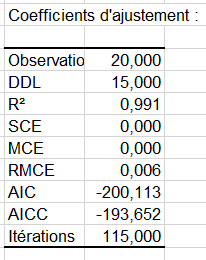 Le premier tableau de résultats fournit des statistiques simples sur les données sélectionnées. Le second tableau (ci-dessous) donne les coefficients d'ajustement du modèle parmi lesquels le R² (coefficient de détermination) qui donne une idée du % de variabilité de la variable dépendante, expliqué par les variables explicatives. Plus ce coefficient est proche de 1, meilleur est le modèle. La somme des carrés des résidus (SCE) est le critère utilisé par XLSTAT pour ajuster le modèle.