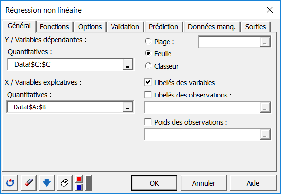 La variable dépendante est ici la « viscosité ». Les variables quantitatives explicatives correspondent aux concentrations « C1 » et « C2 ». Comme les noms des variables ont été sélectionné, il faut cocher l’option Libellés des variables.