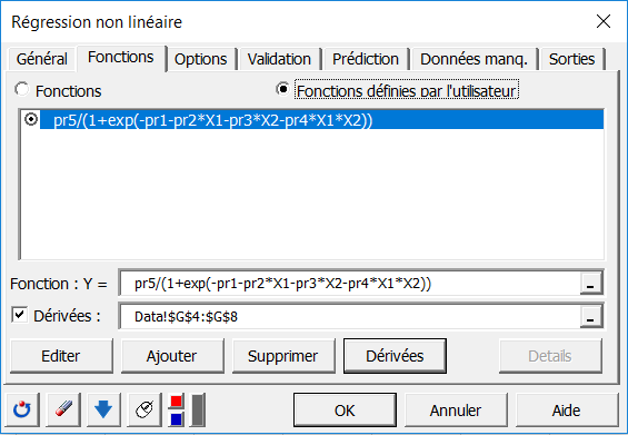 Dans cet exemple, nous allons définir le modèle F(C1, C2) comme décrit au début du tutoriel. Cliquez sur Ajouter et entrez l’équation F(C1, C2) de notre modèle . Cochez l’option Dérivées et sélectionnez les dérivées dans la feuille Excel. Cliquez sur Sauvegarder pour ajouter le modèle à la librairie des fonctions définies par l’utilisateur.