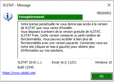 Le message d'erreur suivant s'affiche suite à une installation de XLSTAT si : Vous avez une licence perpétuelle sans accès gratuit aux mises à jour et au support.