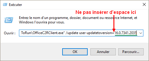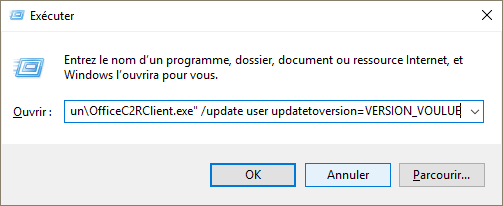 Copiez dans votre presse-papier le contenu de la boite suivante. Ceci peut se faire en la sélectionnant entièrement et en appuyant sur les touches CTRL + C de votre clavier : cmd /k "C:\Program Files\Common Files\microsoft shared\ClickToRun\OfficeC2RClient.exe" /update user updatetoversion=VERSION_VOULUE