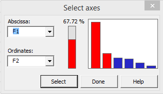 Puis une nouvelle boîte vous permet de choisir les axes pour lesquels les graphiques doivent être affichés. Dans notre cas, le pourcentage de variabilité représenté sur les deux premiers axes n'est pas particulièrement élevé (67.72%) ; pour éviter une mauvaise interprétation des graphiques, un affichage sur les axes 1 et 3 est donc aussi demandé.