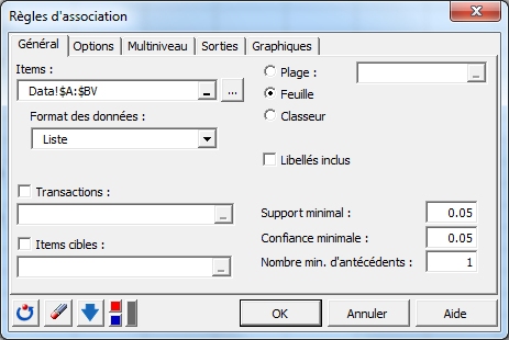 Une fois le bouton cliqué, la boîte de dialogue apparait. Sélectionner les données sur la feuille Excel. Dans la case Items, sélectionner les colonnes A à BV contenant toutes les transactions et les items (afin d’identifier la dernière colonne contenant une transaction, presser Ctrl Fin, ce qui déplacera le curseur en bas à droite du tableau). L’option Libellés inclus est inactivée car la première colonne des données sélectionnées ne contient pas de libellés.