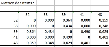 Le tableau suivant est une matrice symétrique résumant les confiances entre produits impliqués dans les règles respectant les critères de support et de confiance minimaux. Ce tableau est utilisé par la suite pour créer une visualisation des produits basé sur leurs proximités et centrée sur la méthode MDS. Cette fonctionnalité unique a été développée par Addinsoft en 2014.