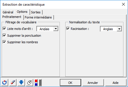 Dans l'onglet Options puis dans le sous-menu Prétraitement, nous choisissons d'activer l’exclusion de la liste des mots d’arrêt (issue de la langue anglaise) ainsi que la suppression de la ponctuation et des nombres via les options Supprimer la ponctuation et Supprimer les nombres. Une normalisation du texte est préférée via l’option Racinisation (anglais) afin de réduire les mots à leur racine commune (à titre d’exemple les termes « love » – « loving » – « loved » – « lovely » sont réduits à leur racine « lov »).