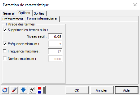Dans l'onglet Options, dans le sous-menu Forme intermédiaire, plusieurs options servent à appliquer un filtrage au niveau de la matrice documents-termes. Nous appliquons un taux de termes nuls de 0,95 (pourcentage de 95%) via l’option Supprimer les termes nuls ce qui aura pour effet de supprimer les termes dont la proportion de présence est inférieure à 5% sur l’ensemble des documents (critiques). Une Fréquence minimum de 2 est choisie afin d’éviter que les termes, qui apparaissent moins de 2 fois sur l’ensemble des critiques, soient présents dans la matrice documents-termes générée.