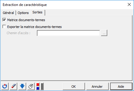 Une seconde option nommée Exporter la matrice documents-termes (non activée dans l’exemple) permet de spécifier le chemin du dossier dans lequel la matrice documents-termes sera exportée au format Excel .csv.