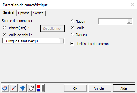 Une fois le bouton cliqué, la boîte de dialogue correspondant à l'Extraction de caractéristique apparaît. Vous pouvez alors sélectionner les données soit via l’option Fichiers (sélection de fichiers .txt) ou bien via le champ Feuille de calcul (sélection de cellules dans Excel). L'option Libellés des documents est activée, car la première colonne de données contient le nom des documents.