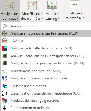 XLSTAT / Analyse de données / Analyse en Composantes Principales, ou cliquez sur le bouton correspondant de la barre Analyse de données(voir ci-dessous).