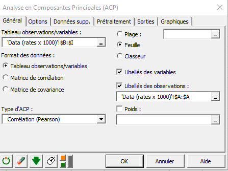 Le Type d'ACP choisi est Pearson (n), ce qui signifie que les calculs seront basés sur une matrice composée des coefficients de corrélation de Pearson, le coefficient de Pearson étant le coefficient de corrélation classiquement utilisé.