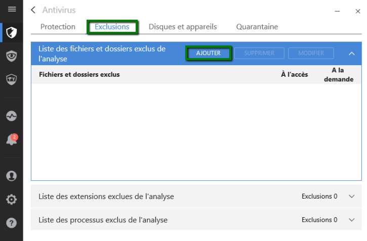 - Sélectionnez l'onglet EXCLUSIONS puis cliquez sur le bouton AJOUTER dans le menu déroulant Liste des fichiers et dossiers exclus de l'analyse.