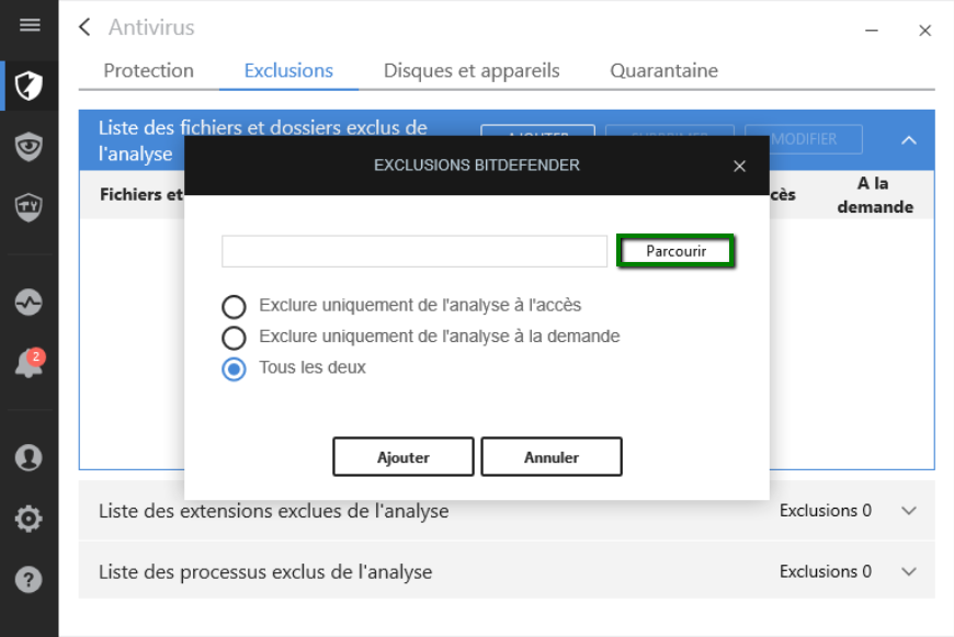 - Cliquez sur Parcourir et sélectionnez l'exécutable EXCEL.EXE à exclure de l'analyse. Veiller bien à choisir l'option : Tous les deux.
