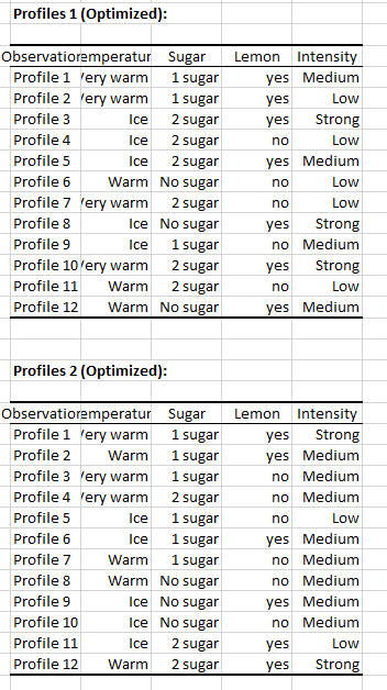 分析の一部として、10人の個人が彼らの紅茶の好みについて質問されました。その結果は、CBC Analysis シートに表示されています。