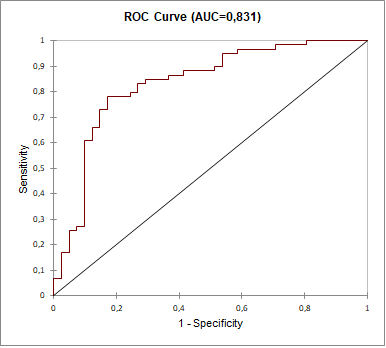 この表に続いて、下のグラフは検証標本でのROC曲線を示します。ROC 曲線は、さまざまな可能なしきい値での (1 – 特異度, 感度) のグラフィカルな表現です。