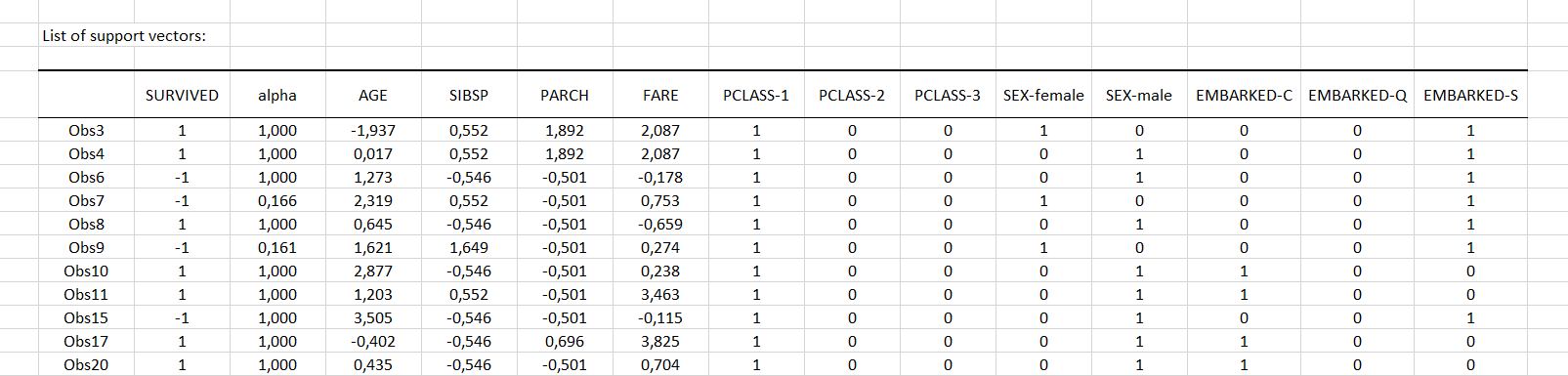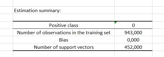 下に示す2番目の表は、452個のサポートベクターの全リストで、関連するアルファ係数の値と陽性と陰性の出力値を伴います。前の表のバイアス値とともに、この情報は、最適化された分類器を完全に記述するのに十分です。