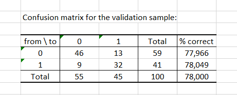 次の表は、検証標本の両方からの結果の混同行列を表示します。この行列は、分類器がどれだけよく働いているかの指標を提供します。検証集合では78%の正解を得ました。