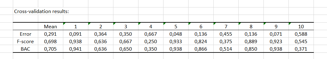 最初の表は、クロスバリデーション(交差検証)の実行結果を示します。各フォルトで、分類誤差率、fスコア、バランス正確度 (BAC) が表示されます。そして、前に選択したパラメータを用いた平均分類誤差率が 29.1% です。