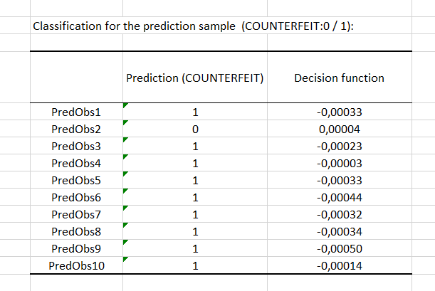 最後に、予測データセットの10個のオブザベーションについて、手法によって予測されたクラスがわかります:最初の列は各オブザベーション について予測されたクラスを示し、2番目の列は決定関数定です。