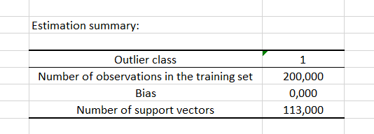 最初の表は、最適化されたSVM分類器の要約を表示します。下図で前に選んだように外れ値クラスが1であることがわかります。分類器のトレーニングに使用された200の観測値があり、そのうち113のサポートベクターが識別され、ゼロに近いバイアスが計算されました。