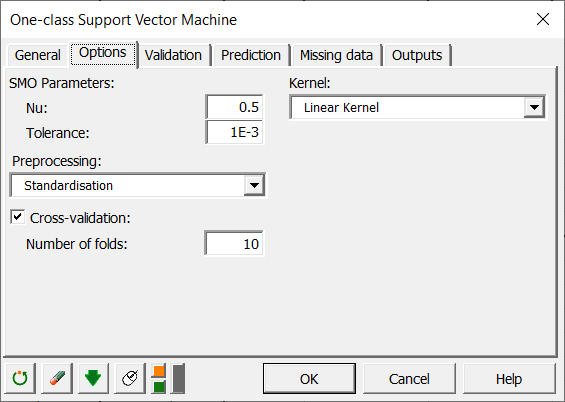 オプション・タブでは、分類器パラメータがセットアップされます。SMO パラメータについては、Nu フィールドが正則化パラメータに対応します。最適化の際に外れ値をパーセンテージに変換します。Nu の値が1に近いほど、外れ値のパーセンテージが大きくなります。