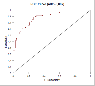 続くグラフは分類器の評価を助けます。ROCは、さまざまな可能なしきい値での(1 – 特異度, 感度) のグラフィカルな表現です。我々は、曲線が左上隅に近いことを望みます: