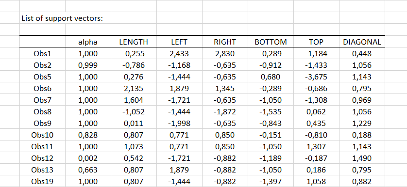 2番目の表は、113個のサポートベクターの完全なリストとそれに関するアルファを示します。前の表のバイアス値とともに、この情報は、最適化された分類器を完全に記述するのに十分です。