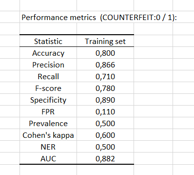 続く表は、10個の指標の表でトレーニング・データセットに関するパフォーマンス・メトリクスを表示します: