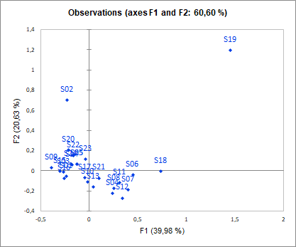 消費者間の視点のこれらの違いをより正確に研究するために、審査員の分析が、それらを表現することを可能にします。我々のデータでは、被験者 S19 が、他の被験者とはまったく異なる視点を持つことがはっきりとわかります。 1つの解決法は、この被験者を除外して分析をやり直すことかもしれません。